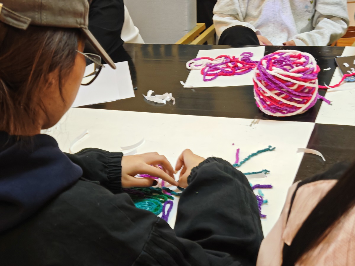 活动开始,部长刘诗怡便以生动的开场,打破了同学们对纤维艺术的固有认知。她指出,纤维艺术并非高不可攀,它就存在于我们的日常生活之中,那些看似平凡的毛线、麻绳以及布料边角料,皆可成为创作的绝佳素材。通过详细的讲解,向同学们展示了纤维艺术的多样可能性,让大家重新认识了这些常见材料的独特之处。