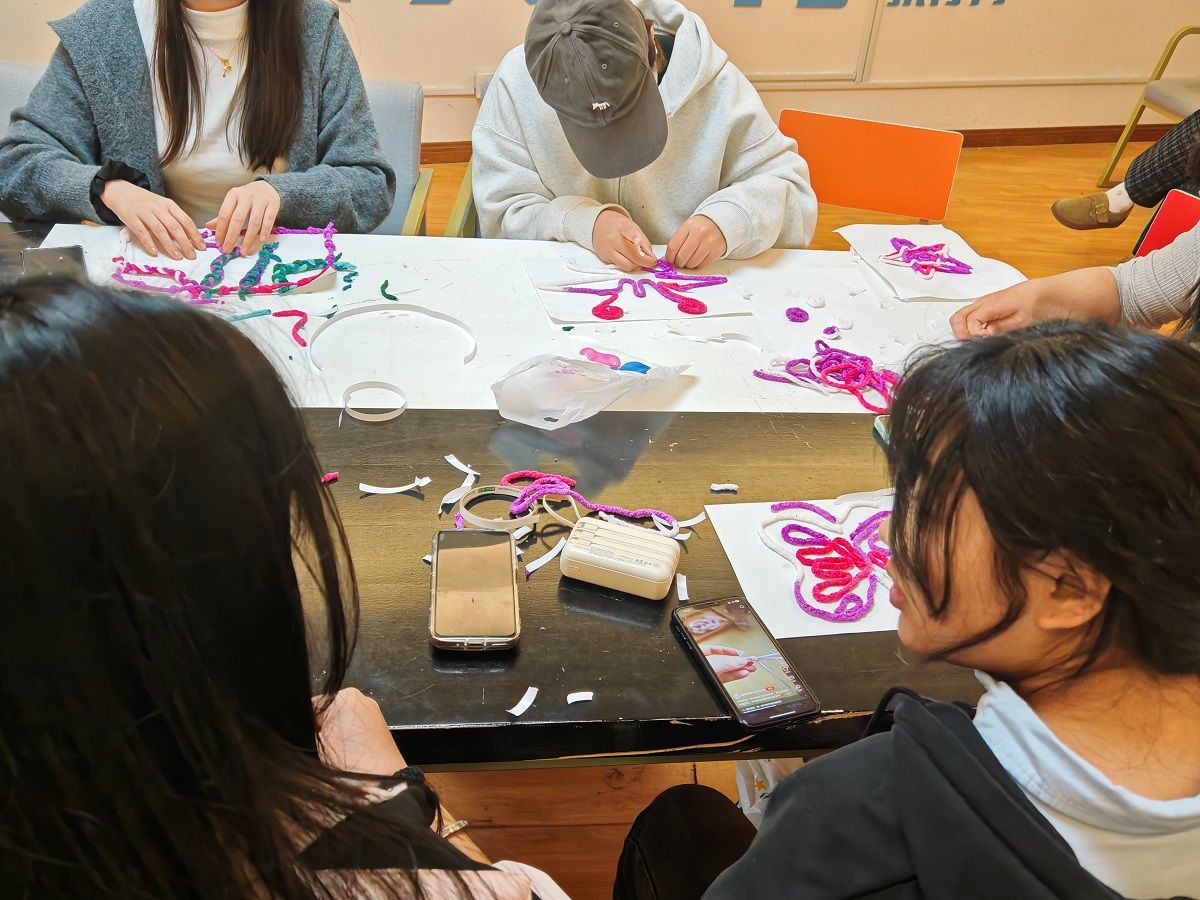 在基础技法教学环节,部长刘诗怡从编织、缠绕、粘贴等简单易懂的操作入手,进行了细致入微的演示。耐心地向同学们示范每一个步骤,从如何挑选合适的材料,到编织时的手法、缠绕的力度以及粘贴的位置,都讲解得十分清晰。为了让零基础的同学也能快速上手,还不时地停下来解答同学们的疑问,现场互动频繁,气氛热烈。同学们纷纷拿起材料,在学姐的指导下,认真地模仿操作,逐渐掌握了基本技巧。