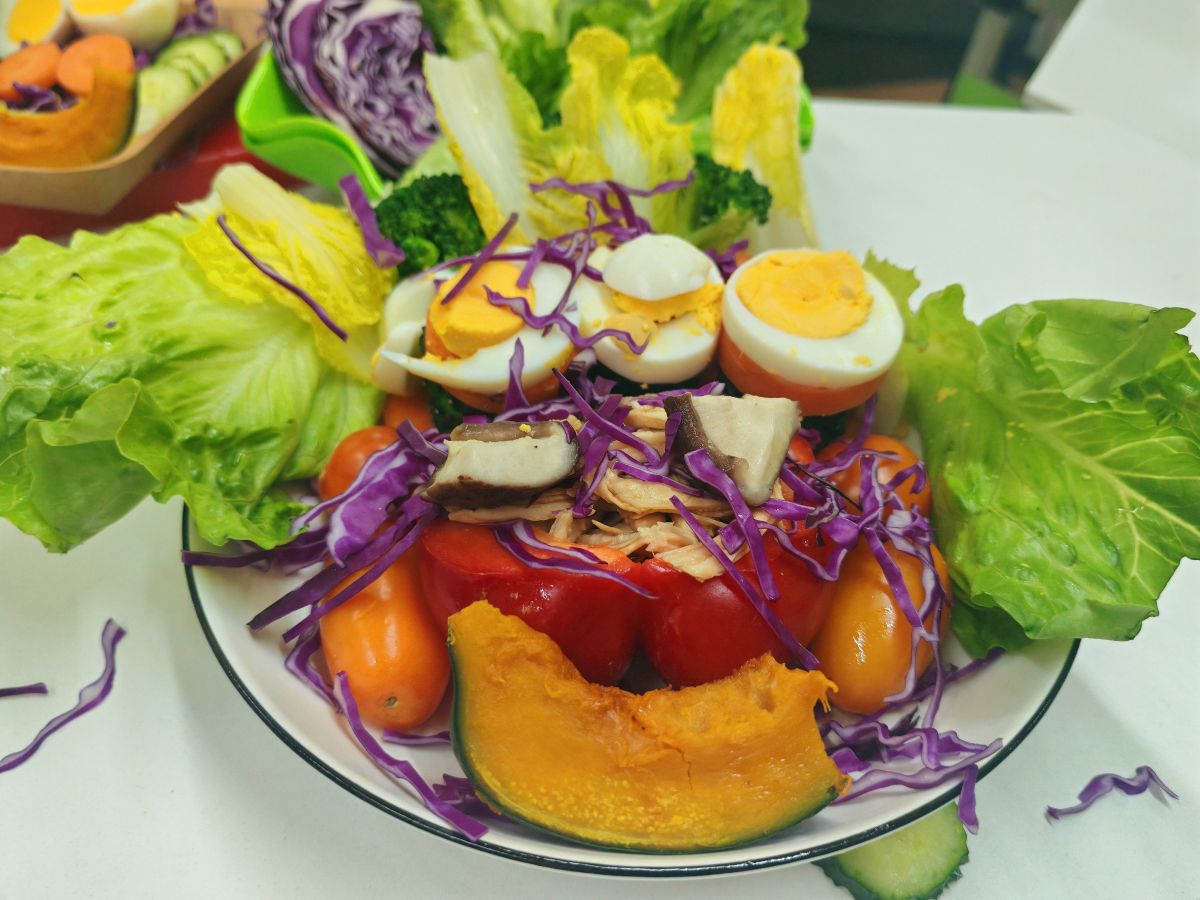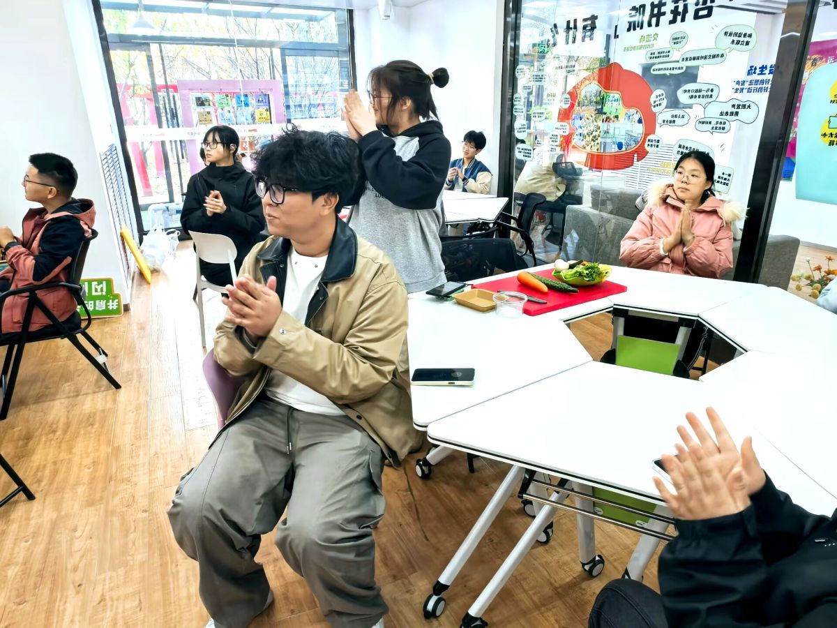 三组的“绿叶菜”基本忙活了一小时,各组的轻食作品都争先亮相!每组上台“安利”自己的作品:第一组的“时蔬鸡胸能量盘”,低卡高蛋白,还用食物摆成星星,颜值绝了;第二组的“翠彩轻蔬碗”,生菜打底撒油醋汁,主打高纤维,摆盘灵感是“落日余晖”,胡萝卜丝、黄瓜丝当“晚霞”,仪式感拉满;第五组的“彩虹蔬菜卷”,羽衣甘蓝卷进彩椒里,低脂沙拉酱一淋,颜色超治愈,还寓意“每天多吃菜,健康自然来”。