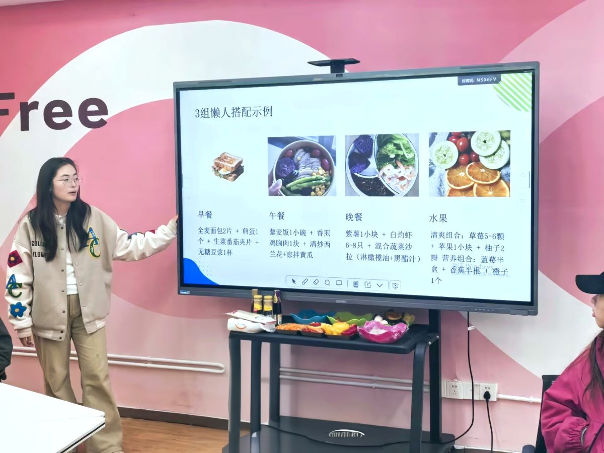 活动进入讲解人的轻食营养科普。她的科普直接“破防”——别以为轻食就是啃草!人家分三大类:想控体重的选“低碳水轻全食”,多吃全谷物;运动后要补能?“高蛋白能量轻食”安排上,鸡胸肉、鱼虾管够;想肠道舒服?“高纤维蔬菜轻食”就是你的菜,维生素拉满!她还强调:“轻食关键是均衡,不是只吃菜,得按自己需求搭!”台下同学提问声此起彼伏,互动感直接拉满!