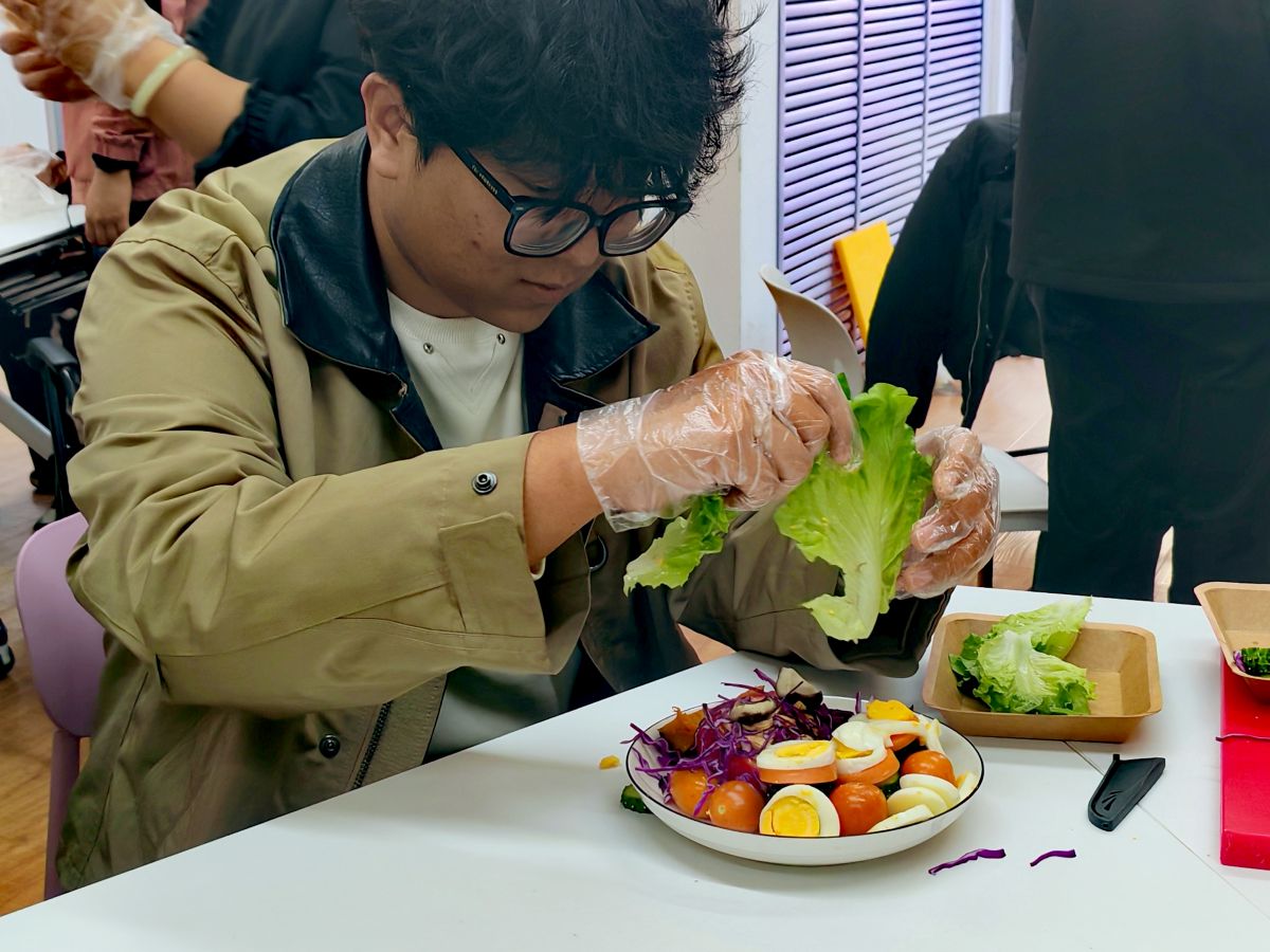 活动氛围迎来高潮,各小组根据选到的食材清单,结合所学营养知识,在规定时间内完成食材搭配升级与轻食创意方案设计。从日常饮食中常见的鸡蛋、全麦面包、鸡胸肉,到应季的新鲜蔬果,原本看似普通的食材,在参与者的巧思下,即将焕发健康美味新活力。