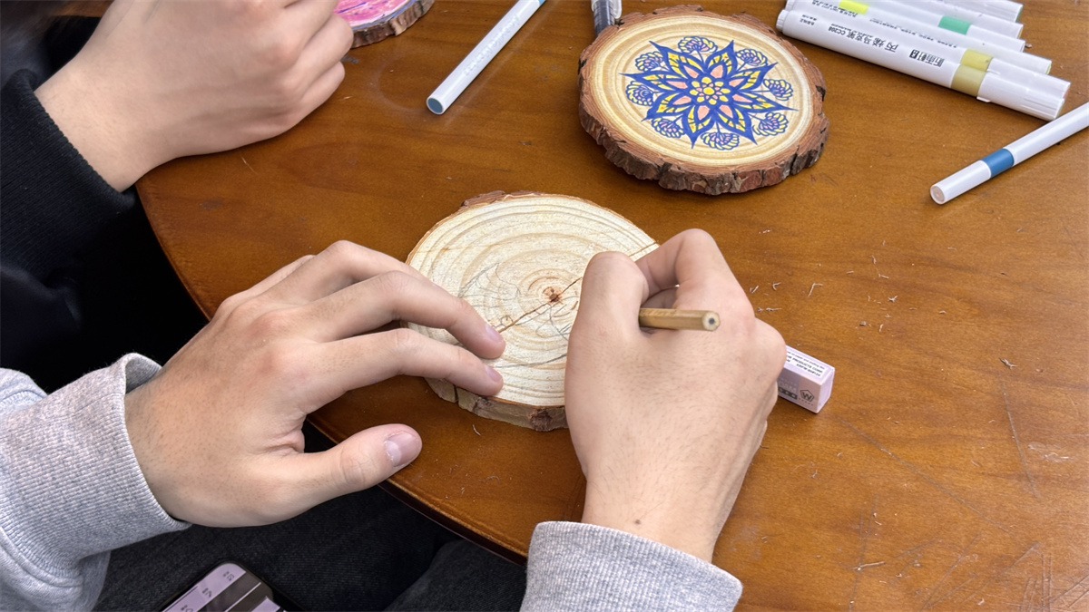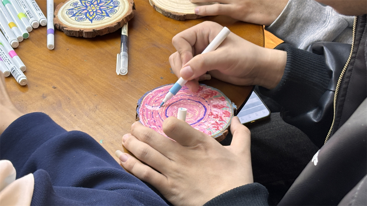 冥想结束后,同学们正式进入生命年轮绘制环节。大家手持画笔,选取心仪的色彩,以年轮为创作载体,以曼陀罗的艺术逻辑为指引,自由勾勒线条、大胆涂抹色彩。有的同学用明亮温暖的色调描绘顺遂的成长时光,有的同学用层次丰富的色彩记录成长中的挑战与收获,有的同学则在年轮中点缀象征希望的图案,表达对未来的憧憬。在专注的创作过程中,同学们忘却压力与烦恼,完全沉浸在艺术创作的快乐之中,让情绪自然流淌,让心灵得到温柔疗愈。