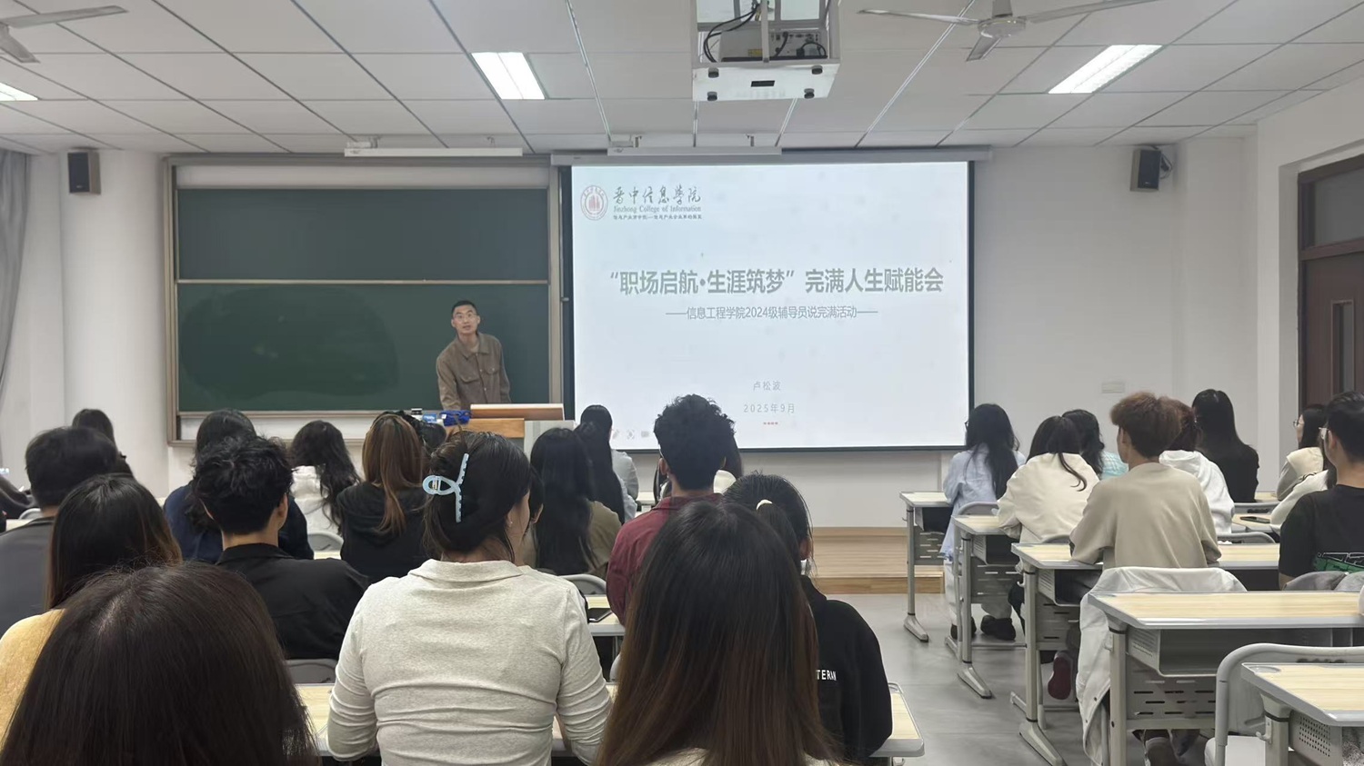 为了破解当下同学们的就业“心理困境”,引导其准备当下、挖掘潜力、化焦虑为行动,9月28日下午,信息工程学院2024级辅导员卢松波老师于7教102开展“职场启航·生涯筑梦”为主题的辅导员说完满活动,通过人格测试明晰自身特质与职业兴趣,全方位护航学子校园生活与未来职业发展。引导学子们“准备当下、多挖潜力”破解就业迷茫,到用科学测评帮大家“读懂自己、选对方向”,活动全程聚焦“成长痛点”,用扎实的内容为学子扫清障碍、注入信心。