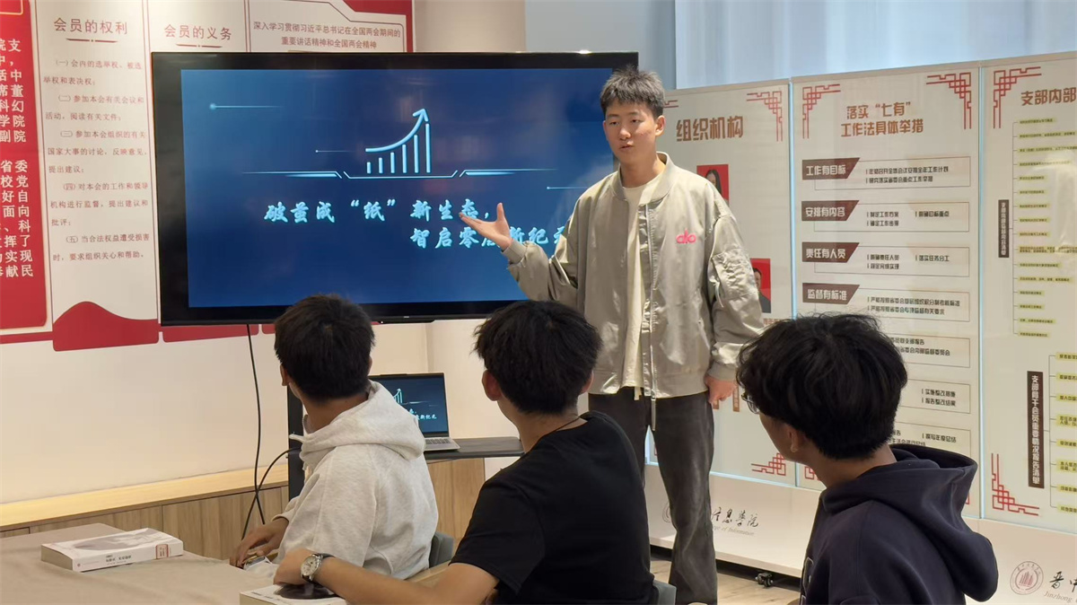 在同学们热烈地分享后,电子(专升本)2402班的侯耀辉学长走上台,与大家交流科研相关内容。刚一开口,就有同学举手:“学长,科研过程中肯定会遇到很多难题吧?你是怎么克服的,能给我们分享个例子吗?”贺嘉昊学长思索片刻,讲述了自己曾在一个项目中遇到数据传输不稳定的问题,团队成员查阅大量文献、反复调试参数,甚至熬夜讨论方案,“过程很煎熬,但当问题最终解决,那种成就感是难以言喻的。所以想告诉大家,科研需要耐心,更需要团队协作和不放弃的精神。”