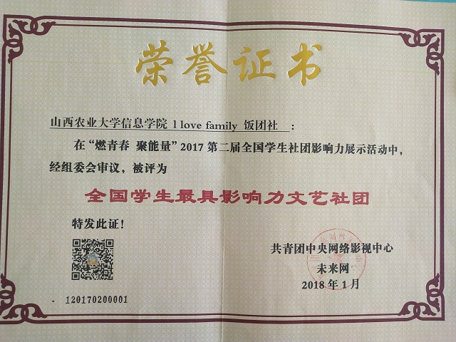 山西农业大学信息学院I love family饭团社在“燃青春 聚能量”2017年第二届全国学生社团影响力展示活动中荣获“全国学生最具影响力文艺社团”第一名,这是我们社团全体成员相互协作、齐心协力共同努力的结果,同时也...