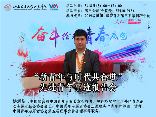 青春须早为,岂能长少年。青年是新时代的栋梁之才,是民族复兴的中坚力量,为激励广大青年积极投身志愿服务事业,担当青年时代责任,5月8日下午,我校青年志愿者联合会邀请第23届中国青年五四奖章获得者洪润浩,面向...