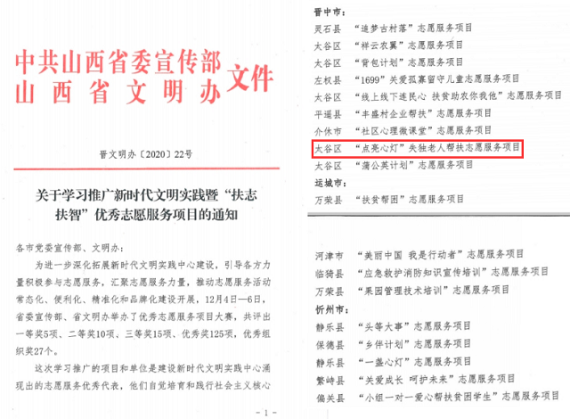 近日,中共山西省委宣传部、山西省文明办联合发布新时代文明实践暨“扶志扶智”优秀志愿服务项目大赛获奖结果,我校“点亮心灯”失独老人帮扶行动项目荣获优秀奖。 两年不间断服务,失独老人找回幸福时光。据了...